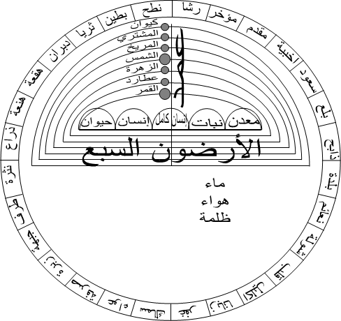 من جهة أخرى نحن لا نستطيعُ فصل العالَم المادي عن العالَم المُجرّد أو الروحاني، لذلك يخلط ابن العربي بينهما أحياناً فنراه يرسم على سبيل المثال عموداً للإشارة إلى الإنسان الكامل وهو العقل الأوّل وكذلك الجوهر الفرد، الذي يعدّ على أكمل صورة إلهيّة في الكون، وبالتالي فهو العمد الذي يستند عليه العالَم. ومن جهة أخرى نراه أيضاً يرسم السماوات السبع كما لو أنها مستندة على الطبقات السبع للأرض، ولكنّ ابن العربي لا يعدّ أنّ تلك هي الصورة الطبيعية الفعلية للأشياء، لأنّه يُصرّحُ بشكل واضح كما رأينا بأنّ الأرض كروية وبأنّها تدُورُ حول مركزها.[51]